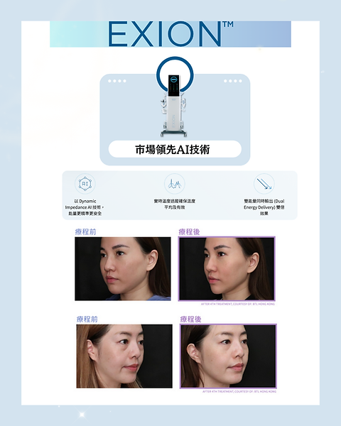 1.主要是用什麼技術?以獨創專利單極射頻(Monopolar RF) 結合 TUS 超聲波(Targeted Ultrasound) 技術,雙能量同步輸出,重啟纖維母細胞回復肌底年輕活躍度,刺激纖維母細自生透明質酸、膠原蛋白及彈力蛋白,撐起肌底,改善膚質及因老化而產生的肌膚問題,令肌膚更飽滿年輕。EXION™ 以市場領先AI技術 - Dynamic Impedance AI,能量更精準更安全;此外,機身介面有實時溫度追蹤,確保溫度平均有效。